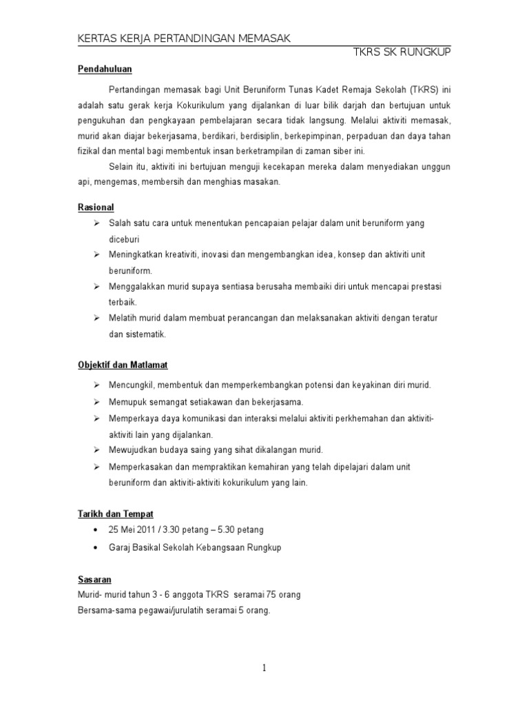 SEKOLAH KEBANGSAAN JERANGAU 23200 BUKIT BESI DUNGUN TERENGGANU KERTAS KERJA PERTANDINGAN MEMASAK ANJURAN PERSATUAN PUTERI. KERTAS KERJA KURSUS ASAS MEMANAH 10 PENGENALAN Rasulullah SAW sentiasa menunjukkan contoh terbaik kepada sahabat dalam soal ibadah mahupun perkara membabitkan kehidupan seharian. Pertandingan memasak 8 orang setiap pasukan 1000 pagi minum pagi.