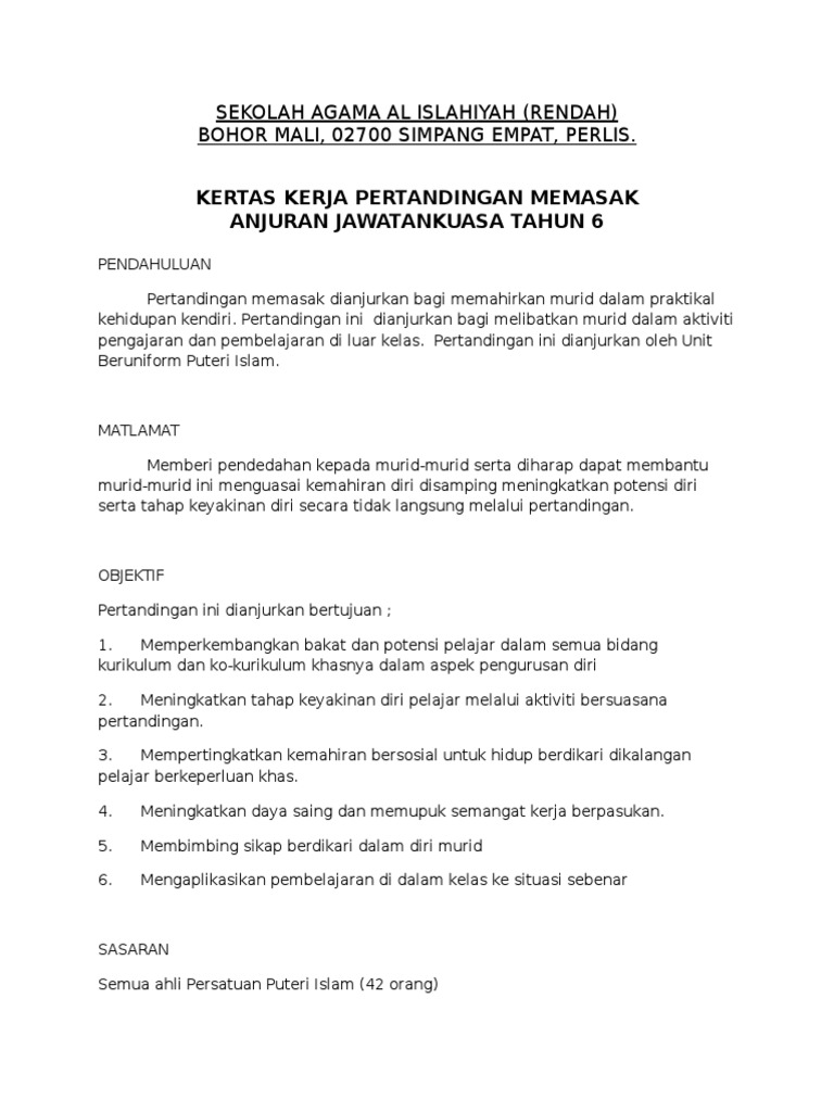 Setiap tahun pihak sekolah akan merancang program dan aktiviti khas untuk kecemerlangan akademik khasnya untuk murid tahun 6 yang akan menduduki UPSR. Kertas Kerja Pertandingan Memasak. PENDAHULUAN Pertandingan memasak dianjurkan bagi memahirkan murid dalam praktikal kehidupan kendiri.